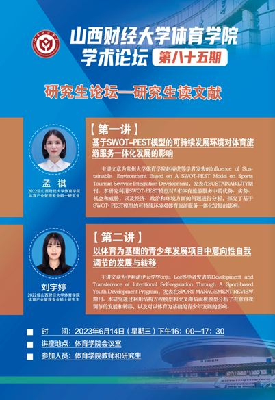 614日下午,我院学术论坛第八十五期研究生论坛——研究生读文献在必威BETWAY西汉姆联会议室举办。2022级体育产业管理专业硕士研究生孟祺和刘宇婷两位同学进行文献精讲,我院全体研究生及必威BETWAY西汉姆联部分教师参加研讨,学院学科和研究生办公室主任王雁副教授主持论坛。