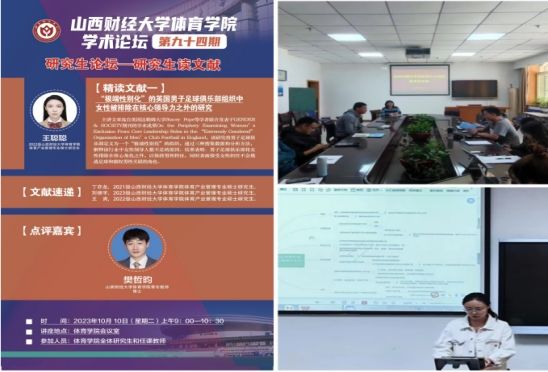 10月10日上午,必威BETWAY西汉姆联学术论坛第九十四期研究生论坛——研究生读文献在必威BETWAY西汉姆联会议室举办。本次论坛由2022级体育产业管理专业硕士研究生王聪聪同学进行文献精讲,21级丁亦龙、2023级刘德宇和2022级王爽三位同学做文献速递。必威BETWAY西汉姆联教师杨海涛、吕栋和常垒,青年博士教师许磊以及全体研究生通过线上与线下相结合的方式参与研讨与交流。本次论坛特邀我院青年教师樊哲昀博士担任点评嘉宾,并在学院学科和研究生办公室主任王雁副教授的主持下圆满结束。