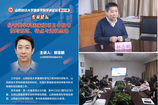 为提升2024年度国家级科研项目申报质量,进一步提高项目申报的成功率,推动学院科研工作再上新阶梯,应我院邀请,公共管理学院党委副书记、原我校科研部项目科科长郝志鹏于12月12日下午在必威BETWAY西汉姆联会议室作题为“经管类学科国家级项目申报书撰写规范、特点与逻辑思路”学术讲座。必威BETWAY西汉姆联党委书记李群生、院长张路、学院骨干教师及全体研究生参加学术讲座,必威BETWAY西汉姆联副院长高进主持讲座。