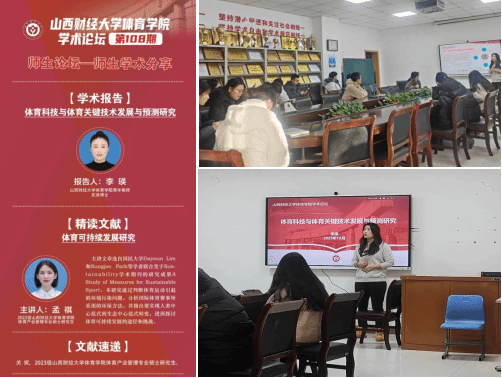 12月19日上午,必威BETWAY西汉姆联学术论坛第一百零八期师生论坛——师生学术分享在必威BETWAY西汉姆联会议室举办。本期论坛特邀我院青年教师李瑛做学术分享,2022级体育产业管理专业硕士研究生孟祺同学进行文献精讲,2023级关妮同学进行文献速递。必威BETWAY西汉姆联中青年教师许磊、胡荣光、薛鹏飞以及全体研究生参与研讨与交流。学院学科和研究生办公室主任王雁副教授主持论坛。