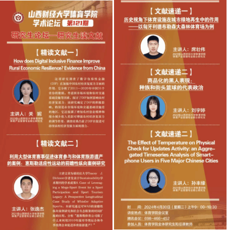 五位研究生同学进行了本期学术论坛文献分享。首先是文献精讲环节,由2023级体育产业管理研究生关妮给大家分享了学术文献“How does Digital Inclusive Finance Improve Rural Economic Resilience? Evidence from China”。这项研究调查了数字包容性金融(DIF)在加强中国农村经济复原力方面的作用,结果凸显了DIF在促进可持续农村经济发展方面的潜力。2021级体育产业管理研究生张逸杰择选了来自堪培拉大学Tracey J. Dickson学者发表于Sustainability学术期刊的学术成果“A Case of Leveraging a Mega-Sport Event for a Sport Participation and Sport Tourism Legacy: A Prospective Longitudinal Case Study of Whistler Adaptive Sports”。该项研究通过对WAS的前瞻性纵向案例研究和社会生态框架的时间扩展的应用,分析“惠斯勒体育公司做了什么来利用2010年温哥华奥运会和冬季残奥会来促进体育旅游遗产”。