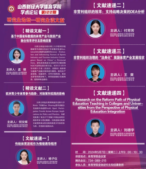 在文献速递的环节里,杨子仪同学选取主题为“传统体育游戏作为情绪诱导程序”,这是一个比较有趣的主题和研究方向,丰富了大家对体育研究的范畴和视野。付芳芳同学对“非营利组织的效率:支持战略决策的DEA分析”进行阐述,本研究对高校体育俱乐部在5个赛季的运作效率进行了分析,效率分析运用DEA方法进行,并结合半结构化互访进行定性分析,最终确定俱乐部采用的组织结构和效率水平结果之间的现有关系。王爽同学就文章《非营利组织治理的“法典化”英国体育产业发展现状》展开论述,该研究旨在通过一个广泛的制度框架和对合法性概念的关注探讨董事会层面缺乏理解的问题,并对英国非营利体育部门法规的深入分析来解决该问题。刘德宇同学基于国家政策的提出并结合个人兴趣的偏好,选取“Research on the Reform Path of Physical Education Teaching in Colleges and Universities from the Perspective of Physical Education Integration”进行分享,简明阐述了在体教融合视角下高效体育教学改革路径的相关研究。