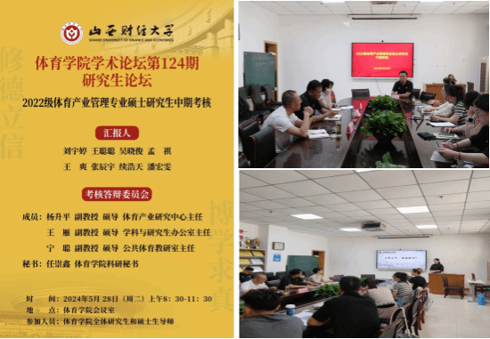 本次中期考核,按照学校、学院相关文件规定要求,对我院硕士研究生培养质量进行了严格的把关与检测。对参加考核的硕士研究生的培养计划履行情况、学科专业知识水平、学科科研与创新综合能力、学位论文开题报告完成情况与质量以及现有科研成果等具体方面进行了全方位、多角度、高层次的考核。8名硕士生围绕以上几个方面内容进行了个人汇报,考核小组对各位硕士生掌握本学科基础理论、研究方法、本领域研究现状和发展趋势给予了针对性指导。经汇报提问答疑环节后,考核组对8位同学的汇报表现进行了考评总结,同学们悉数通过本次中期考核,2022级体育产业管理专业硕士研究生中期考核工作顺利结束。