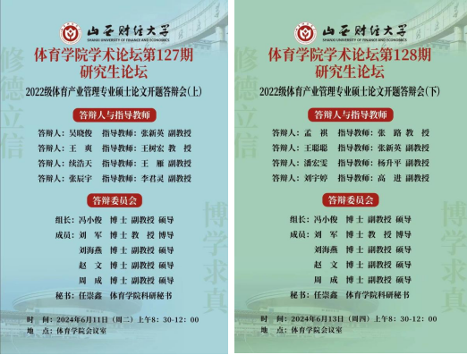 为切实加强研究生培养过程管理,做好研究生学位论文指导工作,必威BETWAY西汉姆联根据本学期研究生培养计划安排,于6月11日和13日上午,分别在学院会议室举办了我院第一百二十七、一百二十八期学术论坛暨我院2022级体育产业管理专业硕士论文开题答辩会。学院全体研究生导师、部分任课教师及全体研究生参加了本次答辩,答辩会由学院学研办主任王雁主持。答辩会上,毕业生经过个人陈述、评委提问、答辩委员会评议和投票表决,8名2022级体育产业管理专业研究生同学全部通过开题答辩。