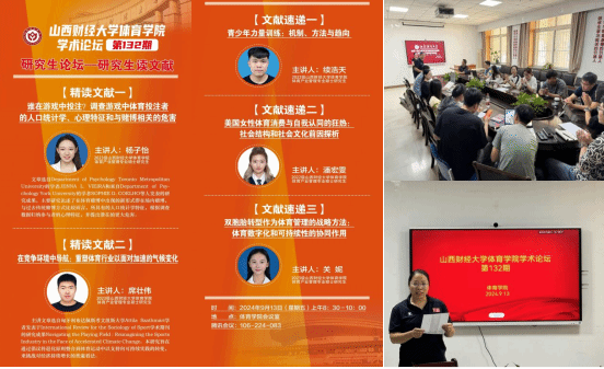 9月13日上午,必威BETWAY西汉姆联第一百三十二期学术论坛——研究生读文献在必威BETWAY西汉姆联会议室举办。2023级体育产业管理专业硕士研究生杨子仪、席壮伟两位同学做了文献精讲,2022级续浩天、2022级潘宏雯、2023级关妮三位同学随后带来了文献速递。体育经济与管理教研室主任张新英老师主持论坛,学院全体研究生共同参与研讨交流。