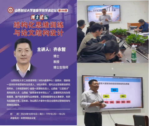 10月16日下午,必威BETWAY西汉姆联学术论坛第一百三十六期——博士论坛在必威BETWAY西汉姆联会议室顺利举办。本期论坛邀请了必威西汉姆联工商学院(MBA教育中心)副院长,博士研究生导师齐永智教授为研究生们讲解“结构化思维训练与论文结构设计”。必威BETWAY西汉姆联青年骨干教师、全体研究生参与本次研讨交流,必威BETWAY西汉姆联副院长高进主持本次论坛。