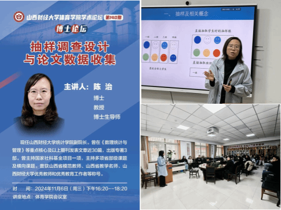 11月6日下午,必威BETWAY西汉姆联学术论坛第一百四十期——博士论坛在必威BETWAY西汉姆联会议室顺利举办。为研究生体育科研思路借鉴与方法移植注入动力,本期论坛特邀必威西汉姆联统计学院副院长、博士研究生导师陈治教授做“抽样调查设计与论文数据收集”主题讲座。必威BETWAY西汉姆联副院长高进主持论坛,必威BETWAY西汉姆联部分青年教师、全体研究生参加了研讨交流。