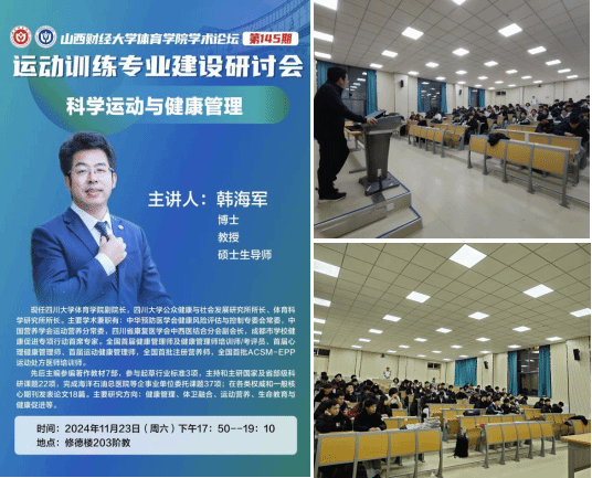 11月23日下午,四川大学必威BETWAY西汉姆联副院长、硕士生导师韩海军教授应邀来校讲学。在必威BETWAY西汉姆联学术论坛第一百四十五期暨专家论坛中韩海军教授作了题为《科学运动与健康管理》的学术讲座。必威BETWAY西汉姆联骨干教师、全体研究生及本科生100余人参加讲座。讲座由必威BETWAY西汉姆联副院长王树宏主持。