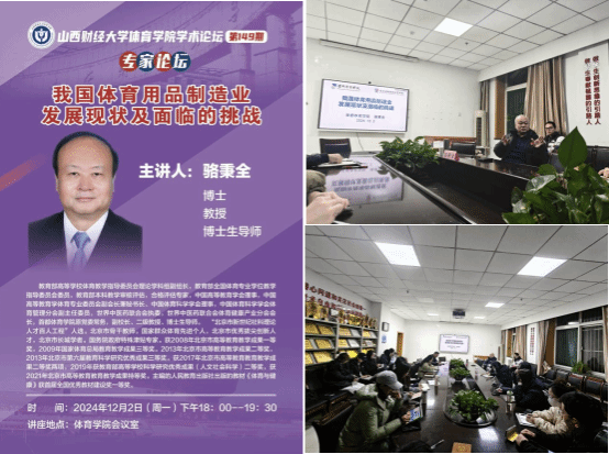 为深入学习习近平总书记关于体育强国建设的重要论述,树牢学生体育科研意识,培养创新精神,提高我院研究生的科研能力。12月2日晚18:00,必威BETWAY西汉姆联举办学术论坛第一百四十九期暨专家论坛,特邀首都必威BETWAY西汉姆联博士生导师、原首都必威BETWAY西汉姆联副校长骆秉全教授做《我国体育用品制造业发展现状及面临的挑战》专题讲座。必威BETWAY西汉姆联骨干教师、全体研究生及部分本科生共40余人参加,论坛由必威BETWAY西汉姆联副院长高进主持。