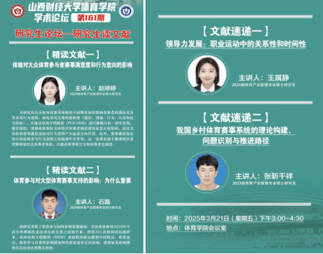 3月21日下午,必威BETWAY西汉姆联第161期学术论坛暨研究生读文献活动在学院会议室成功举办。本次活动以“赛场内外的力量共振——从参与行为到治理范式”为主题,由学院学科与研究生办公室主任王雁副教授主持,全体研究生共同参与。四位汇报人分别通过文献精讲与速递环节,围绕体育赛事管理、参与行为影响及乡村体育发展等议题展开深度探讨,现场学术氛围浓厚。