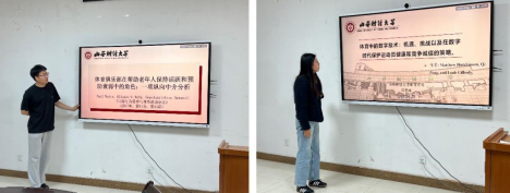 在文献精读环节,三位研究生结合各自研究方向,对体育产业热点议题展开深度剖析。2024级研究生田力月围绕学术文献《体育动机、关系质量与消费意向的关系研究》,从心理学视角解析情感动机如何通过增强球迷与球队的信任及情感联结,显著提升消费意愿,为体育营销的精准化策略提供了理论依据。2024级硕士生张建飞以《数字化转型对文体旅企业质量的倒U型影响》为切入点,解读了资源能力约束下数字化投入的阈值效应,并通过社会网络分析法量化企业整合水平,该研究成果为平衡转型效率与质量提供了方法论参考。2023级研究生席壮伟聚焦老龄化社会健康问题,基于文献《体育俱乐部对老年人健康干预的纵向研究》,运用交叉滞后模型(CLPM)验证了体育俱乐部会员资格通过提高运动参与度降低虚弱风险的中介机制,为社区健康服务模式优化贡献了实证支持。