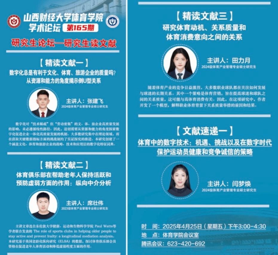 4月25日下午,必威BETWAY西汉姆联第165期学术论坛暨研究生读文献活动在学院会议室举行。本次活动以“体育产业数字化转型与健康促进创新”为主题,由学院学科与研究生办公室主任王雁副教授主持,全体研究生共同参与。通过文献精读、前沿速递与互动研讨,论坛为研究生搭建了学术交流平台,深化了学科理论认知与实践应用的结合。