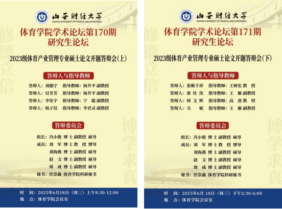 6月18日,必威BETWAY西汉姆联学术论坛第170-171期研究生论坛——2023级体育产业管理专业硕士论文开题答辩会,在必威BETWAY西汉姆联会议室成功举行。本次论坛聚焦研究生学位论文开题环节,旨在严把研究入口关,为后续学术探索奠定坚实基础,吸引了学院师生的广泛关注。