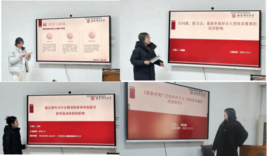 在文献精讲环节,肖卉鑫同学以《“三大球”振兴背景下我国青少年篮球人才培养:美国经验借鉴与中国实践指向》为题展开分享。该研究围绕我国“三大球”振兴与体教融合政策,梳理了青少年篮球培养中存在的主要问题,通过借鉴美国培养体系,提出了强化体教融合、扩大篮球传统校规模、构建 全国性竞赛体系等实践路径,为相关领域发展提供了理论参照。王属静同学分享了题为《旧问题,新方法:重新审视举办大型体育赛事的经济影响》的文献。该研究通过方法创新,重新评估夏季奥运会和世界杯对主办国经济的长期影响,重点关注就业、基础设施与国际形象等方面的效应,为客观认识大型赛事效益提供了新的分析视角。
