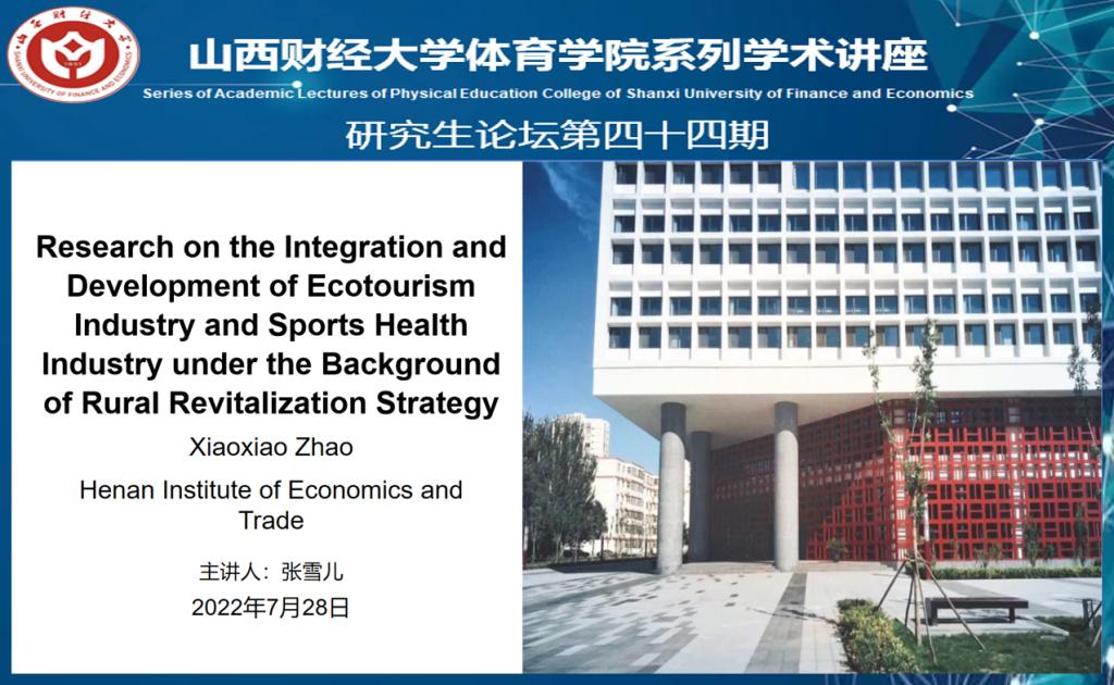 7月28日下午,我院研究生论坛第四十四期通过线上腾讯会议顺利举行。本次研究生论坛由2020级硕士研究生李杨帆主持,由2020级体育产业管理专业研究生王欣宇、张雪儿分享文献阅读情况,参与本次论坛的有我院部分任课老师和全体体育产业管理研究生。