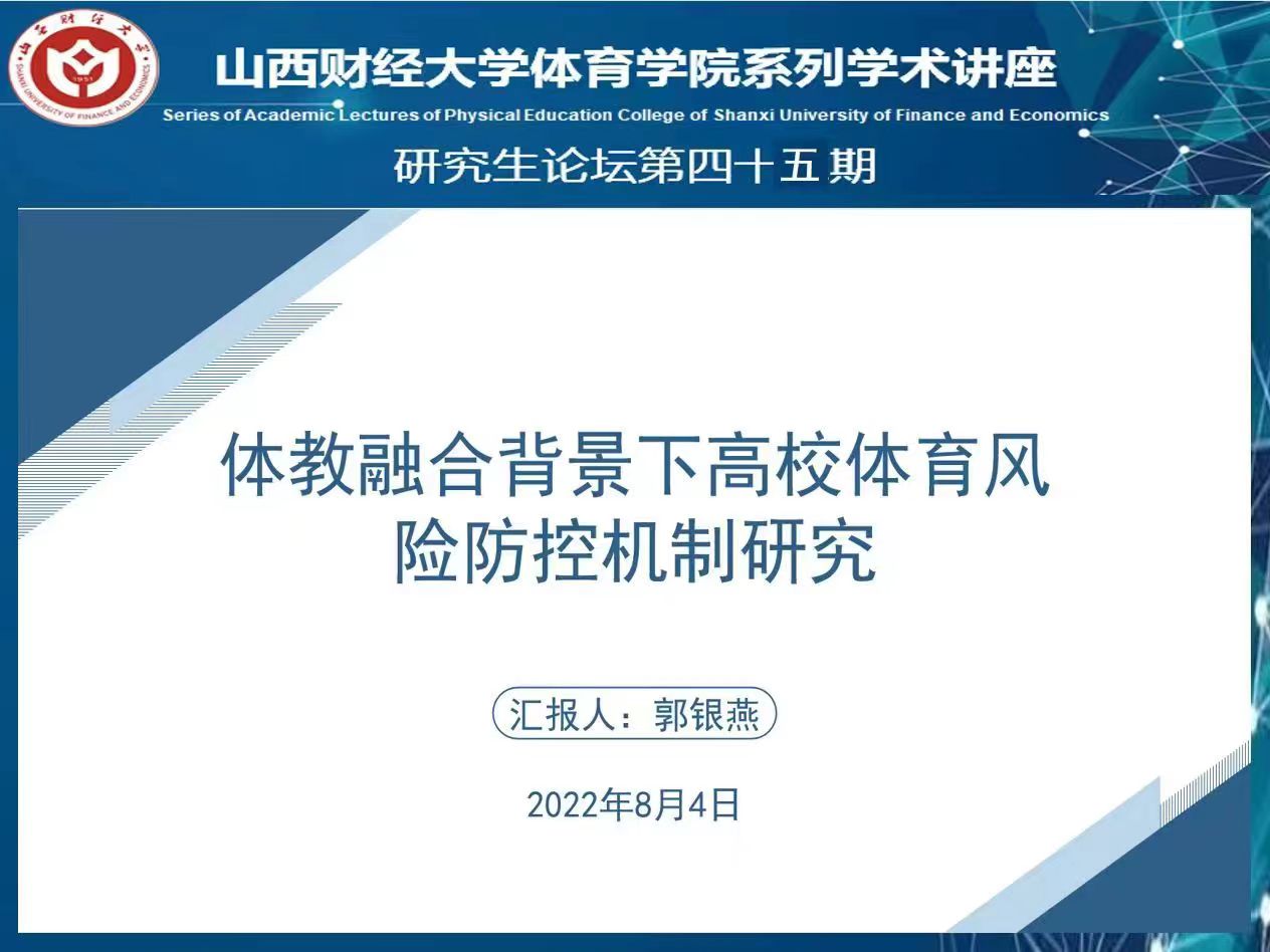 8月4日下午,我院研究生论坛第四十五期通过线上腾讯会议顺利举行。本次研究生论坛由2020级体育产业管理专业研究生李杨帆和郭银燕同学分享文献阅读情况,王欣宇同学主持会议,参与本次论坛的有我院部分任课老师和全体体育产业管理专业研究生。