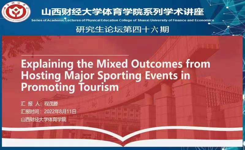 论坛第一讲由程茂滕同学分享精读文章,主讲文章为加拿大卡尔顿大学José I教授的Explaining the Mixed Outcomes from Hosting Major Sporting Events in Promoting Tourism,来自Tourism Management期刊,文章主要运用问卷调查法探究大型体育赛事的举办对当地旅游业促进与阻碍的影响效果。