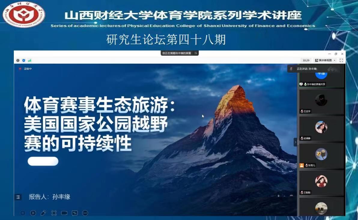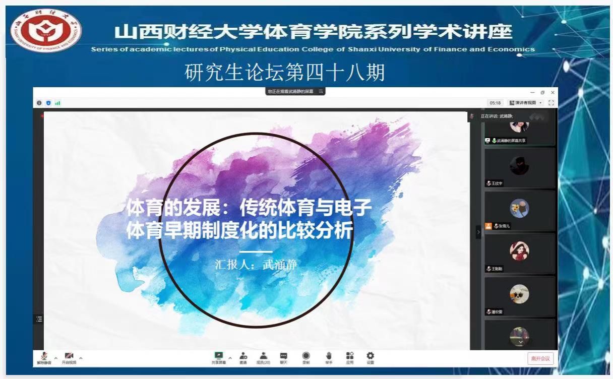 8月25日下午,我院研究生论坛第四十八期通过腾讯会议顺利举行。本次论坛由2021级体育产业管理专业研究生武涌静和孙丰缘同学分享文献阅读情况,张雪儿同学主持会议,参与本次论坛的有我院部分任课老师和全体体育产业管理专业研究生。