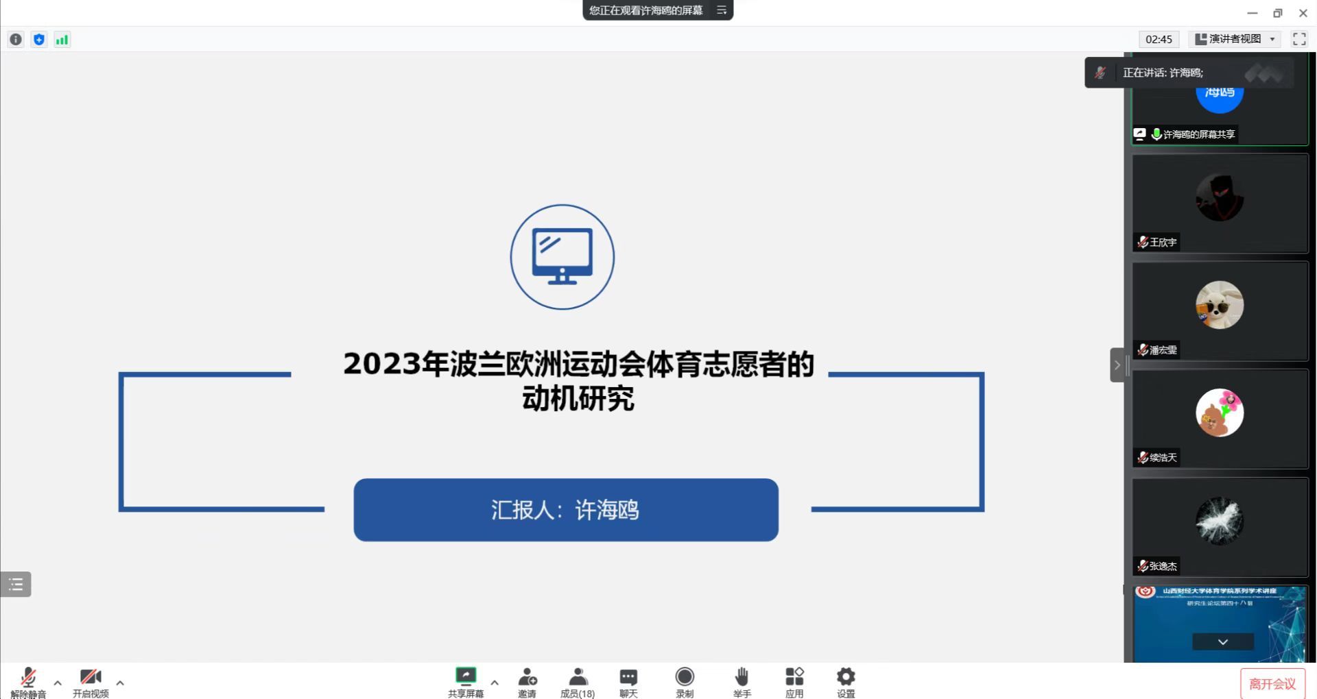 论坛第一讲由许海鸥同学分享精读文章,主讲文章为波兰波兹南体育大学体育科学系体育旅游系学者Mateusz Rozmiar与学者Joanna Poczt联合发表Motivations ofSportsVolunteers at the2023EuropeanGames inPoland,来自Sustainability期刊,文章主要探索了社会人口因素与波兰2023年欧洲运动会志愿者报名动机之间的关系。