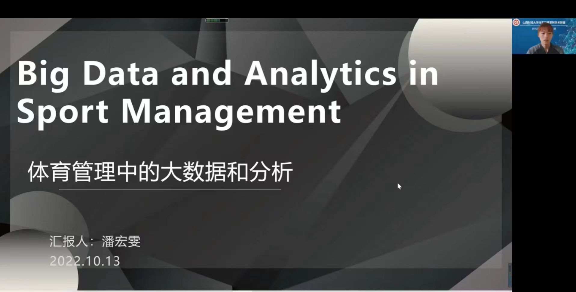 潘宏雯同学的主题为“体育管理中的大数据和分析”,主讲文章由南卡罗莱纳大学Nicholas M.Watanabe、Stephen Shapiro和天普大学的Joris Drayer等学者联合发表的Big Date and Analytics in Sport Management,来自Journal of Sport Management期刊,文章探讨了体育领域大数据和分析的演变,突出该领域的关注点,扩展大数据理论。介绍了大数据和分析在该学科和体育管理文献中的重要性,提供了特刊中包含的每篇文章的摘要,强调了未来研究的方向,并确定了这个多元化领域的挑战和障碍。