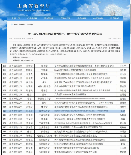日前,山西省教育厅公布《关于2023年度山西省优秀博士、硕士学位论文评选结果》,我院2020级体育产业管理专业硕士研究生程茂滕毕业论文《数字经济驱动体育旅游产业高质量发展的作用机理与实证检验——以黄河流域为例》(硕士生导师:张路)获评2023年度山西省优秀硕士学位论文,此前,该论文已获评2023年度必威西汉姆联优秀硕士学位论文。