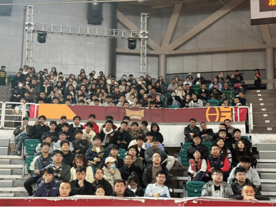 “山西,加油!”“汾酒!防守!”2024年4月6日晚,红灯笼体育馆,场上山西汾酒男篮巅峰对决,场下山财学子呐喊助威。2023-2024赛季中国男子篮球职业联赛(CBA)常规赛第52轮比赛,山西汾酒男篮主场以117:103战胜北京控股队。