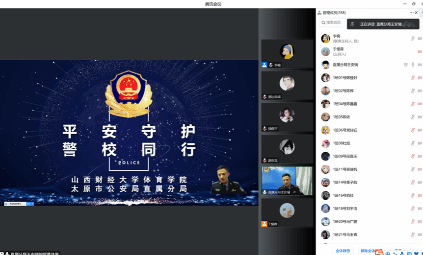 为提升大学生安全防范意识,增强自我保护能力,营造健康、和谐的校园环境,2022年11月8日下午,我院邀请太原市公安局直属分局指挥室副主任、太原市公安局反诈讲师王安瑞警官做了题为“平安守护,警校同行”的大学生安全知识教育主题讲座。我院副书记郝丽霞、全体辅导员和全体学生参加。活动由学院团委书记李楠主持。