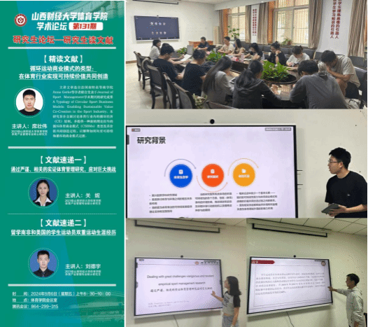 9月6日上午,必威BETWAY西汉姆联学术论坛第一百三十一期学术论坛——研究生读文献在必威BETWAY西汉姆联会议室举办。由体育产业管理专业硕士研究生2023级席壮伟进行文献精讲,2023级关妮、2023级刘德宇两位同学做文献速递。学院全体研究生共同参与研讨交流,学院学科和研究生办公室主任王雁副教授主持论坛。这场本学期第一期论坛伊始,必威BETWAY西汉姆联副院长高进强调了论坛的纪律规范。他指出,认真做事只能把事做对,用心做事才能把事做好。