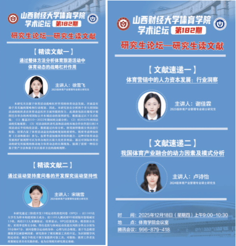 12月18日上午,必威BETWAY西汉姆联第182期学术论坛——研究生读文献在学院会议室举办。本期论坛围绕体育旅游、运动科学、产业发展等方向,由2025级研究生徐雪飞、宋瑞雪进行文献精讲,2025级研究生谢佳霖、2024级研究生卢诗怡进行文献速递。学院全体研究生积极参与研讨,现场交流深入,学术氛围浓厚。学院学科与研究生办公室主任王雁副教授主持。