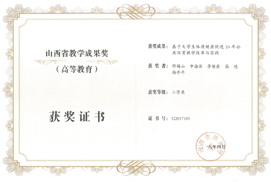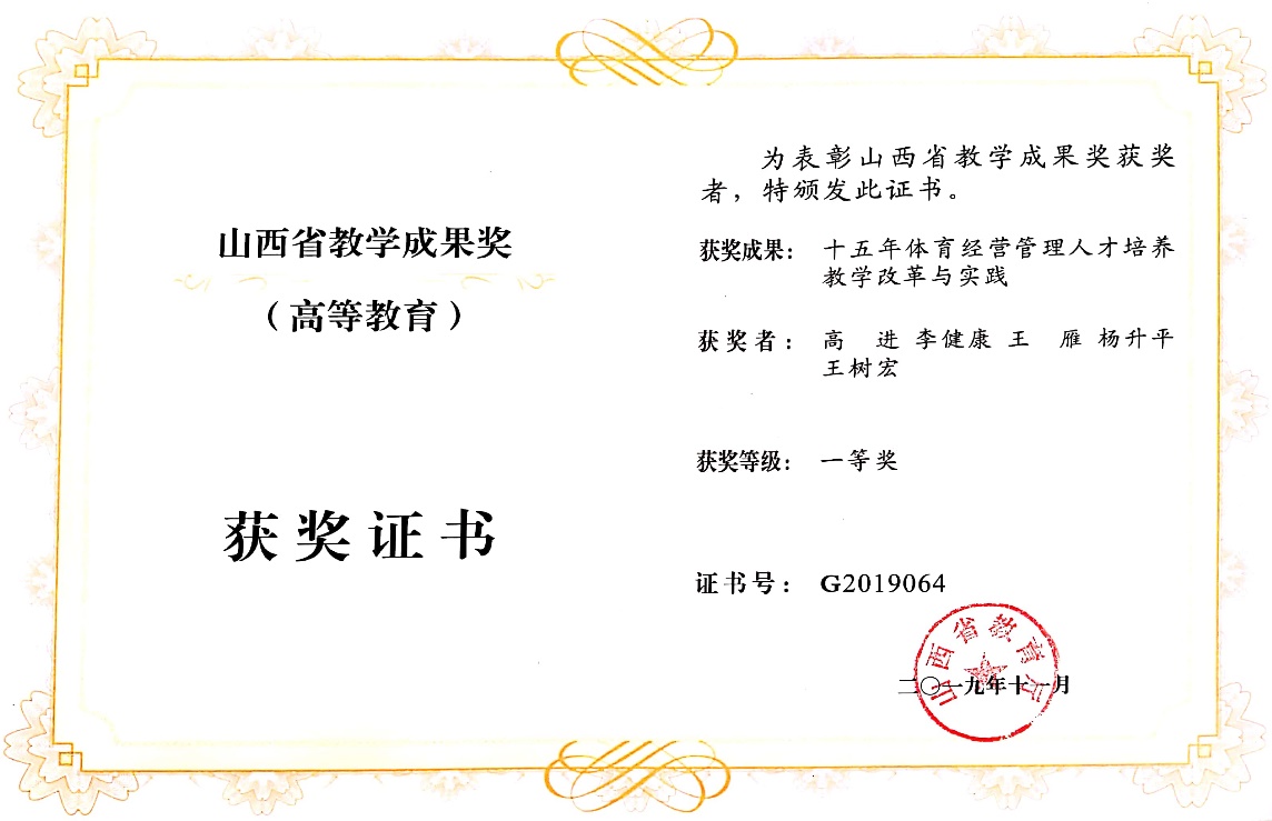 学院自2010起在山西省教学成果奖评选的获奖席位中从无缺席,这在山西省高校体育院系是唯一的。“十三五”期间,我院又两获教学成果奖,分别是由高进副教授主持的《十五年体育经营管理人才培养教学改革与实践》获2019年山西省教学成果一等奖、邵锡山副教授主持的《基于大学生体质健康促进10年公共体育教学改革与实践》获2017年山西省教学成果二等奖,两个成果分别涵盖了体育专业教学和公共体育教学的两个方面,彰显了我校体育专业办学的全面性。