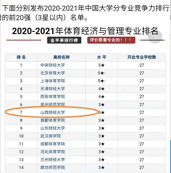 在2020年3月15日发布的《中国大学及学科专业评价报告(2020-2021)》中,我校体育经济与管理专业在全国开办该专业的全部27所高校中位列第7名,排名进入该专业全国前25%行列。