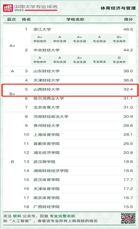 2022年6月18日《软科中国大学专业排名》中,我校体育经济与管理专业排名全国第5,排名进入全国前15%。