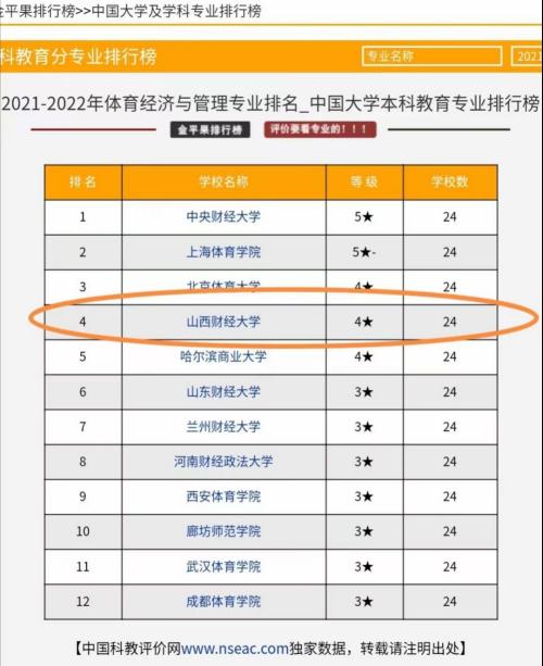 2021年《中国大学及学科专业评价报告》中,我校体育经济与管理专业排名全国第4,排名进入全国前15%。