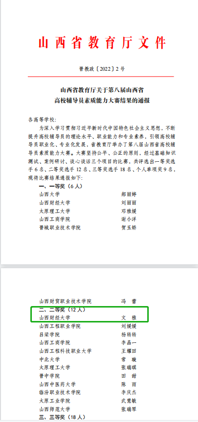 2022年5月19日,第八届山西省高校辅导员素质能力大赛在我校坞城校区圆满落下帷幕。经过激烈的角逐,我院辅导员文雅老师荣获大赛二等奖,并获得“案例研讨优秀选手”的个人单项奖。